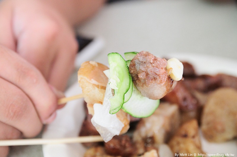 用叉子大腸、蘿蔔、小黃瓜、香腸、蒜頭直接串成一套,一口咬下,爽阿!
